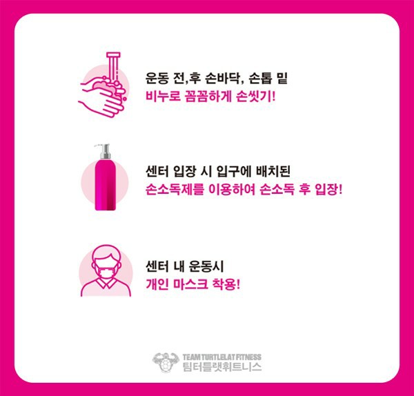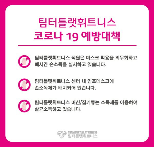 저희 팀터틀랫휘트니스 전지점은 마스크 의무화 착용을 시행하고 있으며